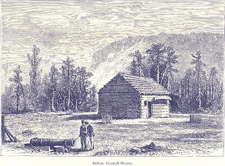 This early image of the Council Grounds was drawn shortly after the "Last Council Fire" was held. Visitors examine the King George Cannon with the Council House in the background. The memorial trees planted at the Council Fire are surrounded by protective fences. |